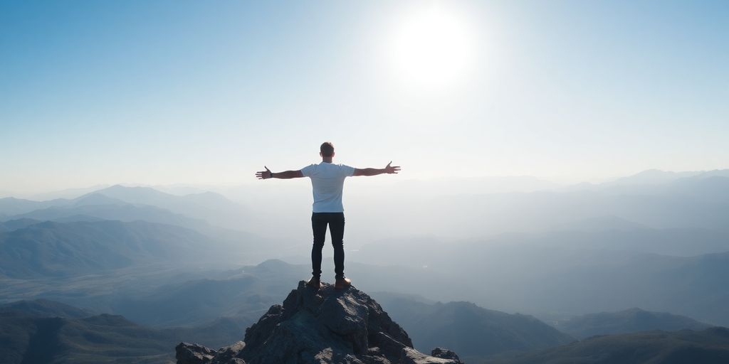 Person looking at distant mountain, overcoming adversity.